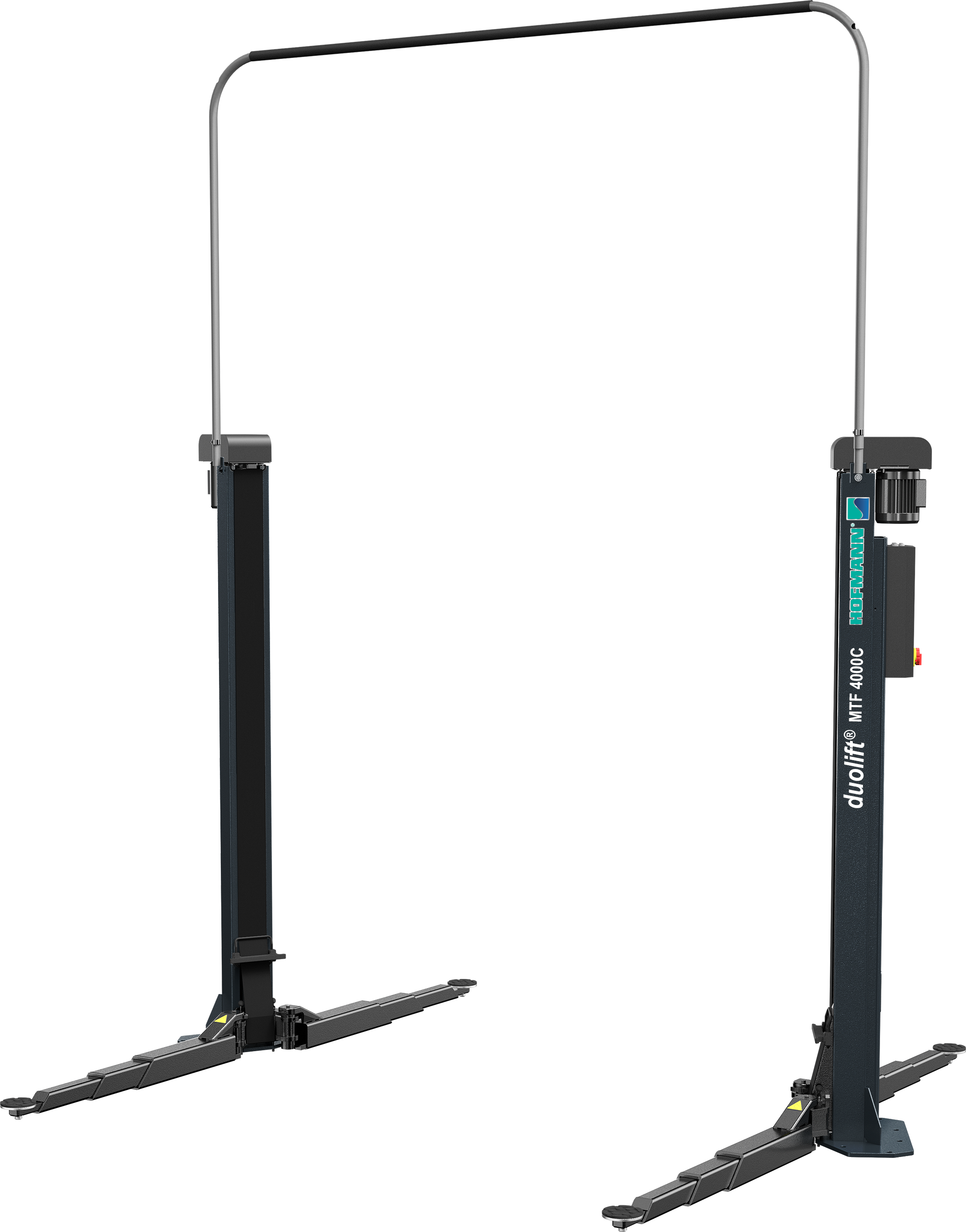 The duolift® MTF 4000C, part of the next-generation series of electromechanical lifts from Hofmann®, is a versatile powerhouse with rugged durability and a lifting capacity of 4.000 kg, suitable for lifting cars, SUVs, and vans.