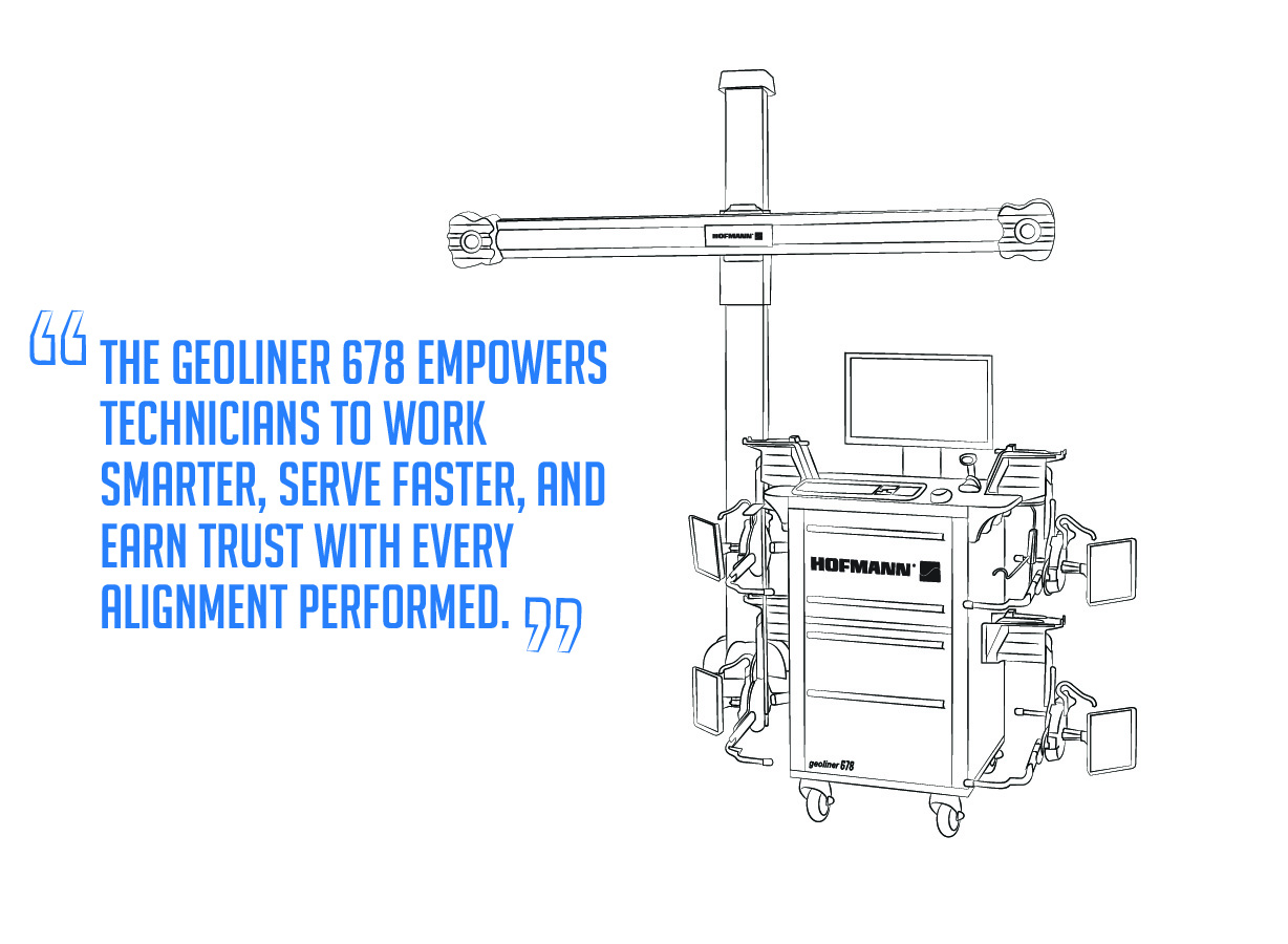 At the core of this trust-building strategy is precision. Accurate alignments protect tires, boost fuel efficiency, and ensure safer driving. Yet many don’t fully grasp the value of the alignment process unless shops demonstrate it clearly. This is where the Hofmann® geoliner® 678 Imaging Wheel Aligner shines. With high-definition cameras, patented guidance systems, and real-time displays, it empowers technicians to actually show customers—not just tell them—why adjustments matter. This transparency builds confidence that keeps customers coming back.